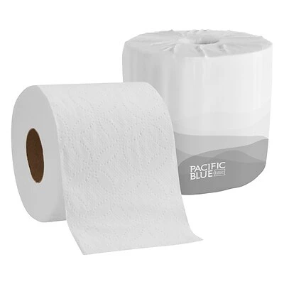 Supply all of your business’s bathrooms with Pacific Blue Basic 1-ply embossed bath tissue. This tissue is compatible with all standard sewer and septic systems, so you never need to worry about a crippling plumbing issue. Each roll is individually wrapped for hygienic purposes. It is also embossed to provide a high-end feel without the associated costs. Finally, it meets or exceeds EPA standards for recycled content by containing 20 percent post-consumer recycled fiber, enabling businesses to ‘go green’ with their choice of toilet paper.