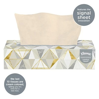 Provide reliable softness and absorbency by keeping this tissue box on hand. This box of 125-sheets of tissue features a flat design with peach colored tissues to signal when it is time for a replacement. These white Kleenex tissues are two-ply and help prevent the spread of germs in the workplace.