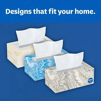 Prevent drippy noses and reduce the spread of germs with this convenient three-box pack of soft, unscented facial tissue. Each box is printed with a vibrant pattern to add a decorative touch to any home or office space. Each box in this pack contains 144absorbent Kleenex facial tissues to last all flu season.