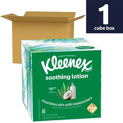 Keep the office stocked during cold and flu season with this pack of facial tissue. Kleenexยฎ Soothing Lotionโข tissues are clinically-proven to be the softest, most gentle lotion tissue* (among national brands), making them perfect for people who want a soothing, gentle touch – whether for allergies, a cold or flu, or frequent, everyday use. The unique lotion formulation, which helps to make these tissues more gentle, is made with aloe vera and vitamin E.