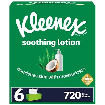 Contains 6 rectangular tissue boxes with 120 Kleenex Soothing Lotion tissues per box = 660 total tissues