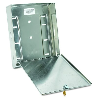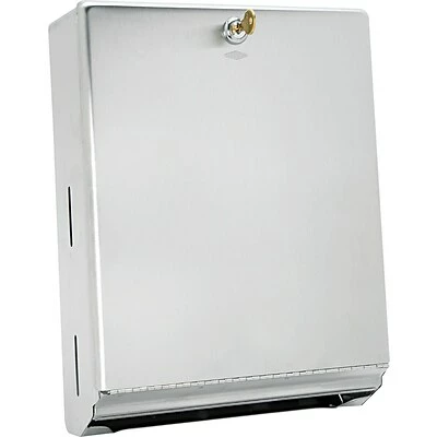 Bobrick dispenser is made of stainless steel with satin finish for added durability. Dispenser measuring 14″ x 10 3/4″ x 4″ features tumbler lock/piano hinge for door and has cabinet slots that indicates refill time.