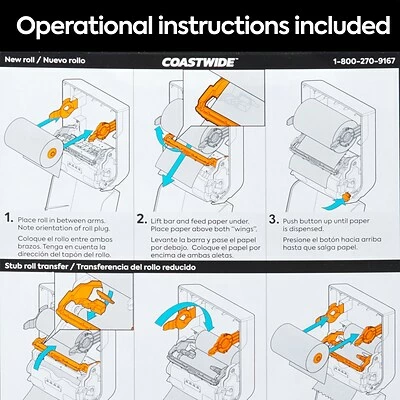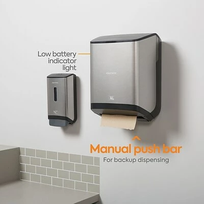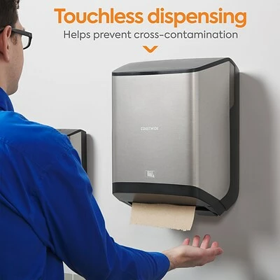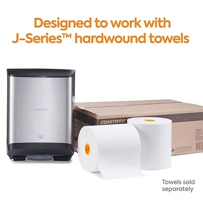 Enable simple hand drying in busy washrooms with this automatic hardwound towel dispenser. The sheet length, sensor distance and delay time are adjustable to make an 800-foot J-Series hardwound towel roll last longer, and the touch-free motion-activated operation helps prevent cross-contamination. This high-capacity Coastwide Professional™ J-Series electronic hardwound towel dispenser boasts color-coded interior touchpoints, so janitorial staff can quickly locate and access touch points for reloading and is engineered to work with J-Series hardwound towel.