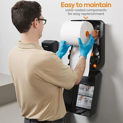 Enable simple hand drying in busy washrooms with this automatic hardwound towel dispenser. The sheet length, sensor distance and delay time are adjustable to make an 800-foot J-Series hardwound towel roll last longer, and the touch-free motion-activated operation helps prevent cross-contamination. This high-capacity Coastwide Professional™ J-Series electronic hardwound towel dispenser boasts color-coded interior touchpoints, so janitorial staff can quickly locate and access touch points for reloading and is engineered to work with J-Series hardwound towel.