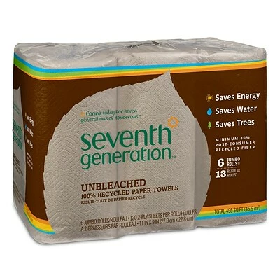 Natural, unbleached paper towels absorb spills quickly, even when wet, and helps you lessen your impact on the planet. High percentage of recycled content helps reduce the need for virgin wood pulp, which means more trees are left standing. Natural unbleached design with no dyes, inks or fragrances saves more natural resources compared to virgin or whitened recycled products by eliminating the whitening process, which saves water and energy. Unbleached pulp paper is made with a chlorine-free process and high percentage of post-consumer recycled content, and its unique color visually cues care for the environment in a way white paper cannot. The two-ply paper towels come in rolls that fit standard household, kitchen roll dispensers.
