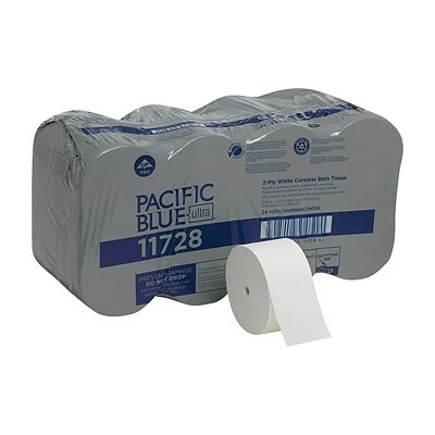 With Pacific Blue ultra coreless toilet paper, there are no cardboard cores, which helps reduce waste and waste handling costs. By combining a coreless roll with only one roll accessible at a time, this toilet paper system helps eliminate stub roll waste. And because there are three rolls that remain completely covered while not in use, that helps protect them from germs and make them more hygienic than jumbo roll bath tissue. The high-density 24-roll cases also help save storage space. They deliver 14.75% more linear feet of toilet paper per case, while using 23% less storage space compared to a jumbo roll 12-roll case with 1,000 feet/roll. Perforated, 2-ply Pacific Blue ultra coreless toilet paper is also easier to use than traditional non-perforated jumbo rolls.